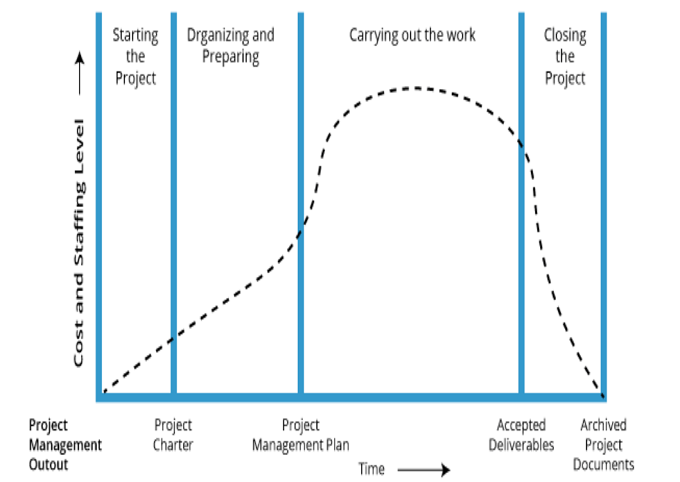 • Lúc đầu, mức chi phí và nhân sự thấp và đạt đến đỉnh điểm khi công việc đang được tiến hành. Nó một lần nữa bắt đầu giảm nhanh chóng khi dự án bắt đầu tạm dừng.